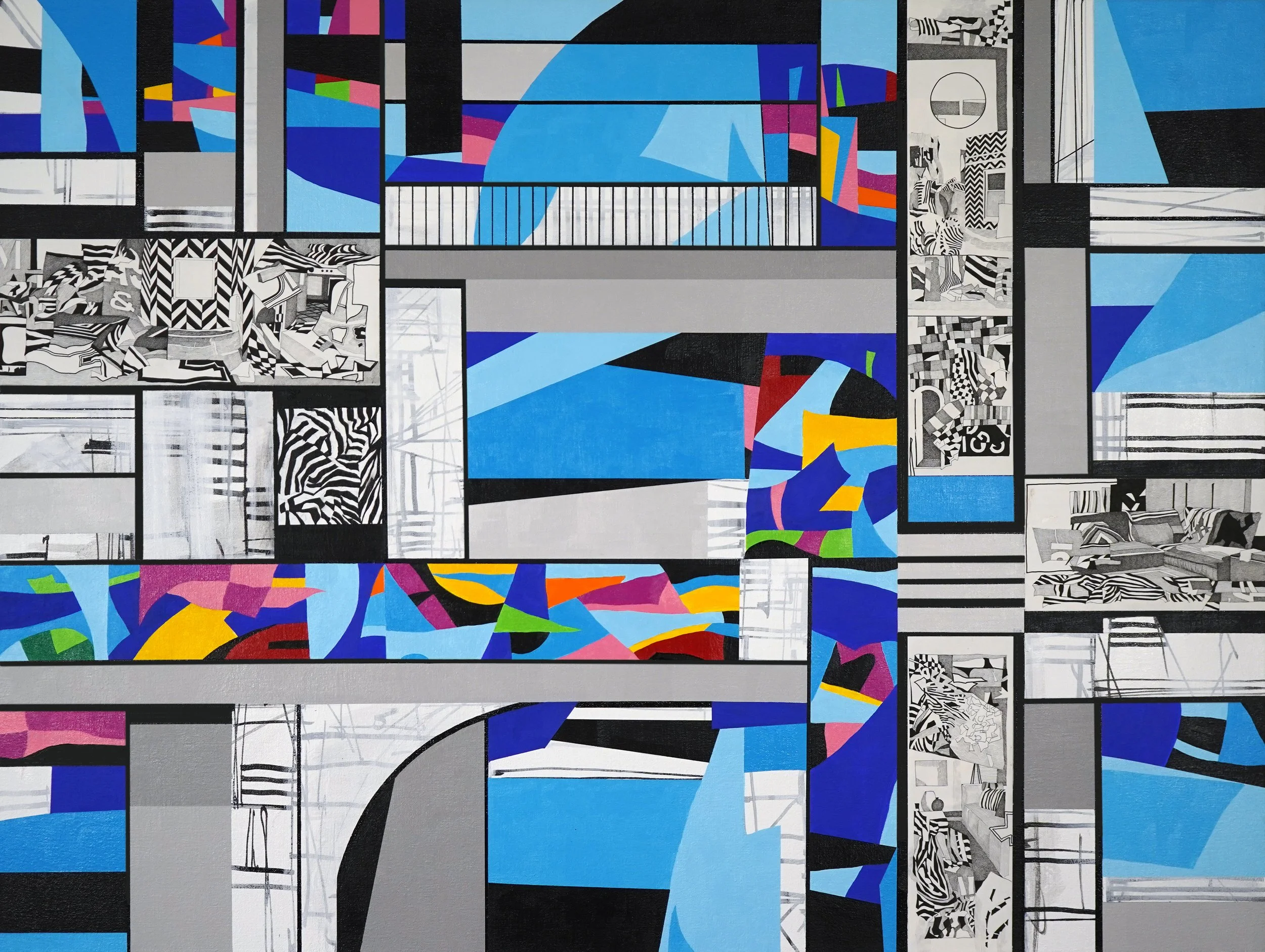 “Aqua Terrace,” pen on paper on acrylic on canvas, 36” x 48,” 2025/ $8,000
